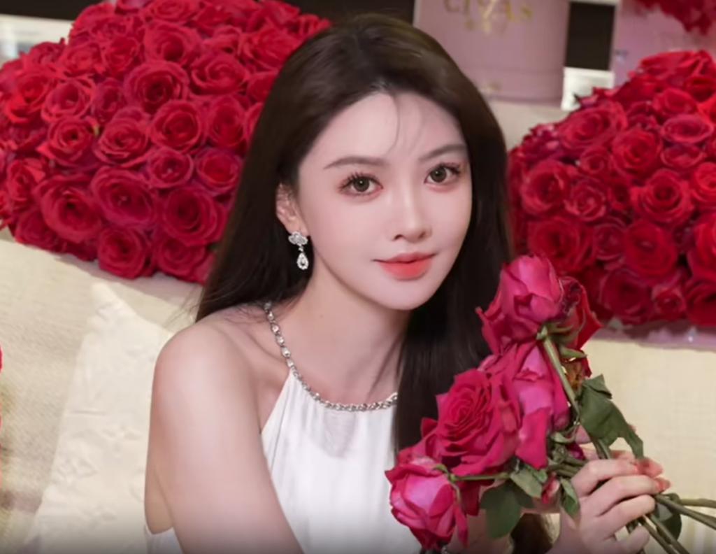 今年 1 月,叶珂发布了一段在玫瑰花堆里幸福微笑的视频。虽然花是真的,但 " 完美 " 的模样很不真实,比如她的头发跟鞠婧祎是一样的,发量多到连发缝都几乎消失,再加上规整的发际线和充盈的额头,科技感扑面而来。