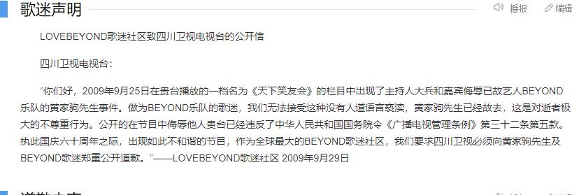 他们谴责这种拿逝者开玩笑的行为,认为四川卫视的娱乐节目,已经触碰到了大家的底线,要求四川卫视,还有嘉宾“棒棒糖”和主持人大兵向黄家驹道歉。