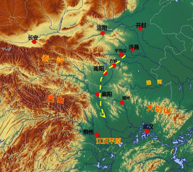 从地形图可以看出,襄阳的西边是秦岭山脉,东边是大别山山脉,两座大山像在此处打开了一座大门,贯通南北,连接起了南阳盆地和江汉平原,其战略意义不言而喻。