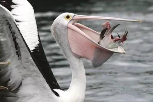 澳洲鹈鹕最显著的特征就是带有一张非常细长的鸟喙,整体呈现粉红色,下嘴壳只有两侧是坚硬的,中间部分则是由皮肤组织构成的喉囊,能够自由的进行伸缩,所以就会显得它的嘴巴很大,据统计据说一只鹈鹕的嘴巴喉囊中能够存放下至少14公斤的鱼,甚至比它本身的胃容量还要多上3倍,简直就是恐怖至极。