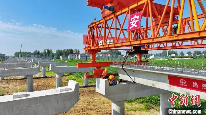 合(肥)周(口)高速颍临段8标施工现场,架桥机在进行箱梁架设施工。