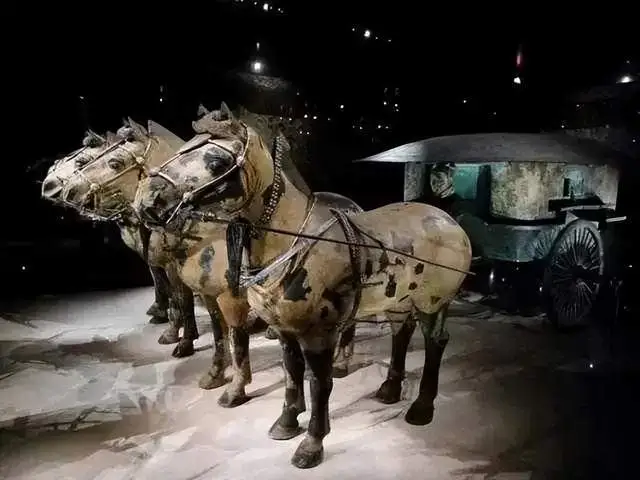 1980 年前发掘出土的壹组两乘大型的彩绘铜车马——高车和安车,是迄今中国发现的体形最大、装饰最华丽,结构和系驾最逼真、最完整的古代铜车马,被誉为?青铜之冠。