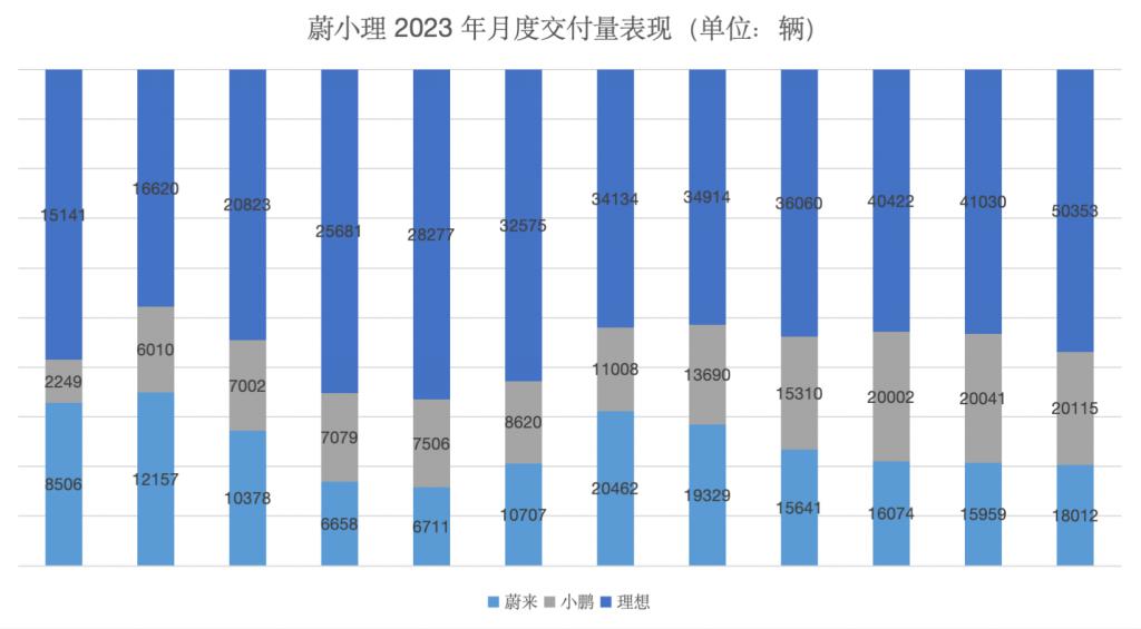 从 2023 年的交付量表现来看,理想以 376030 辆的交付成绩成为三家之最,蔚来和小鹏交付量分别为 160038 辆、141601 辆。