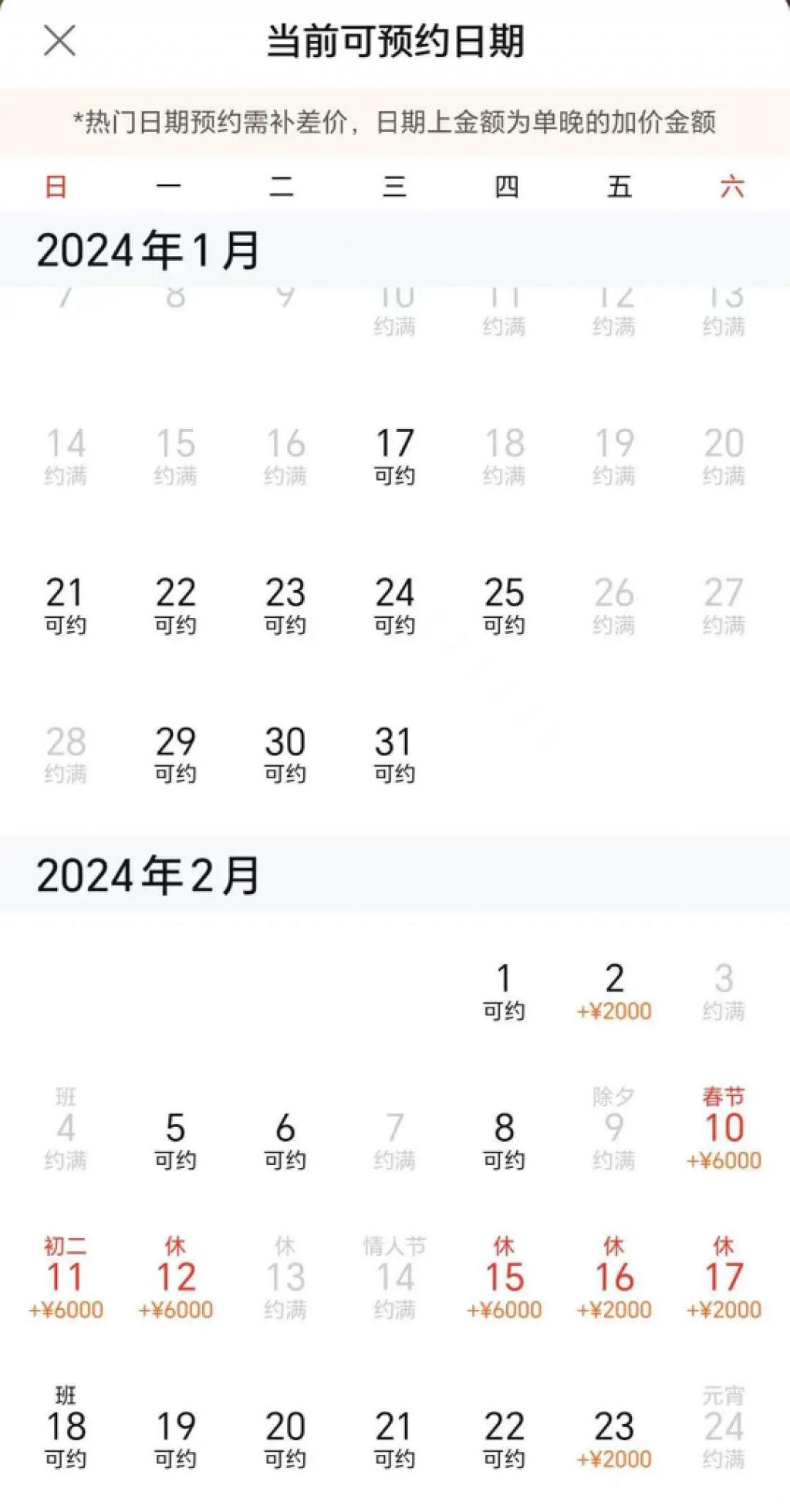 《繁花》会员大结局收官当日,「定焦」咨询了和平饭店的房间情况,工作人员表示,1 月初到 2 月中旬,英国繁花套房,基本每周五、六、日都被约满。根据携程数据显示,其最近的可预约时间排到了 1 月 17 日下周三,下周四到周六也被约满。