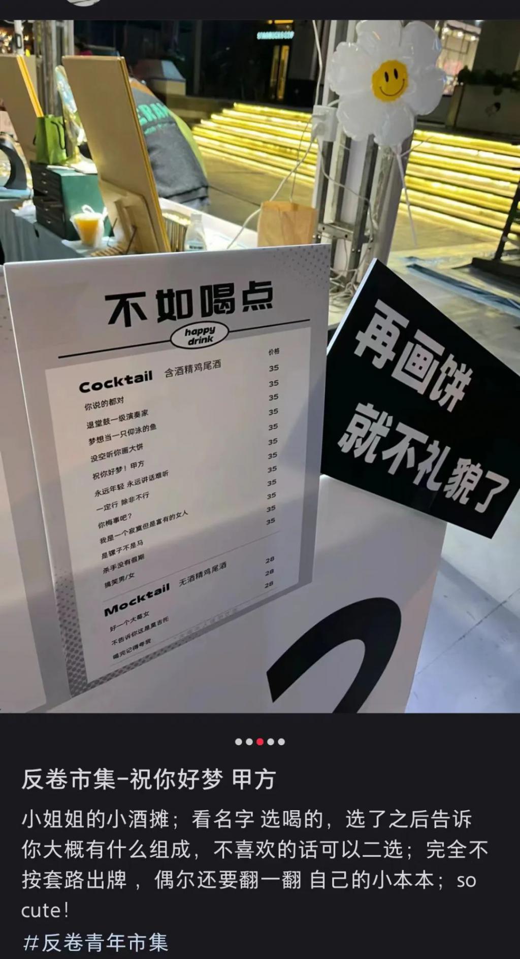 在反卷青年市集里,一位鸡尾酒摊主将打工人的烦恼和精神状态化为饮品名字,「没空听你画大饼」、「永远年轻 永远讲话难听」、「祝你好梦!甲方」等统统售价 35 元。