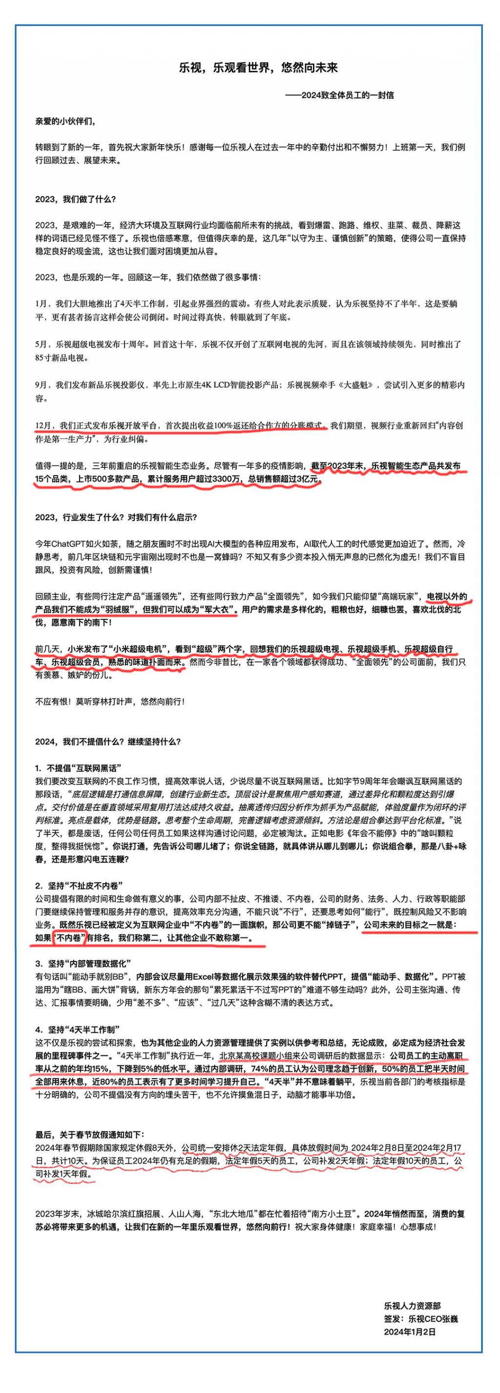 去年元旦,乐视宣布施行每周 4 天半工作制,以 " 无内卷、无 996 的神仙公司 " 之姿,一时成为全网艳羡的对象。时隔一年,乐视再一次抢得新年头彩,在元旦后发布内部信宣布,春节提前两天放假(2 月 8 日至 2 月 17 日,共 10 天)。