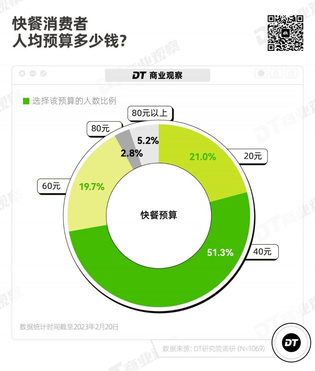 《DT 商业观察》的《快餐小调研》同时发现,如今消费者吃快餐的预算,也在逐渐向正餐看齐:超五成人的快餐预算达到 40 元,而预算 60 元和预算 20 元的快餐消费者,分别占比 2 成。
