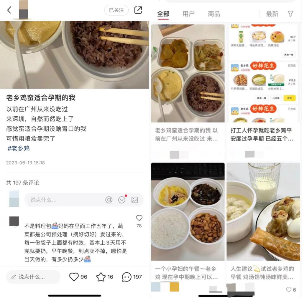从社媒评论来看,老乡鸡成为不少网友怀孕、生病时的首选放心外卖。笔记中不乏:" 打工人怀孕就吃老乡鸡,平安度过孕早期 "、" 病号餐就点老乡鸡 " 等标题。