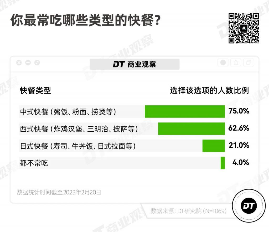 根据《DT 商业观察》2023 年 2 月发布的《快餐小调研》:超半数人一周要吃好几次快餐,快餐正在成为不少人的 " 刚需消费 "。