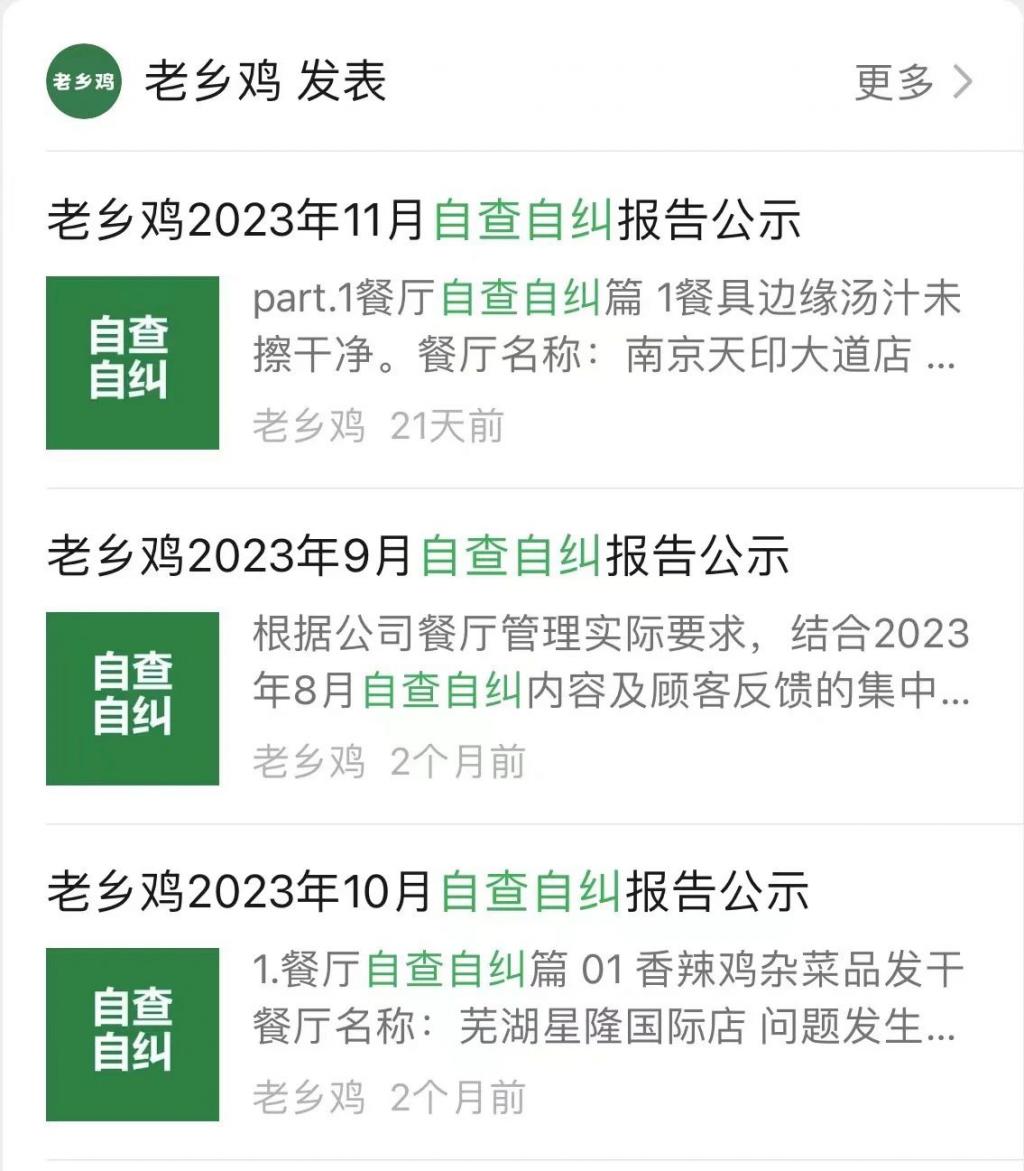 老乡鸡每月自查自纠报告 图源:老乡鸡公众号