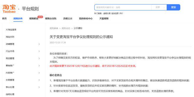 2023 年 12 月 26 日,淘宝实施新规,对买家发起的符合描述不当、混淆误导、伪劣等相关情形的售后,根据商家近期的投诉数量、产品质量、店铺评分等进行评定,并以此作为退货退款或仅退款的依据。
