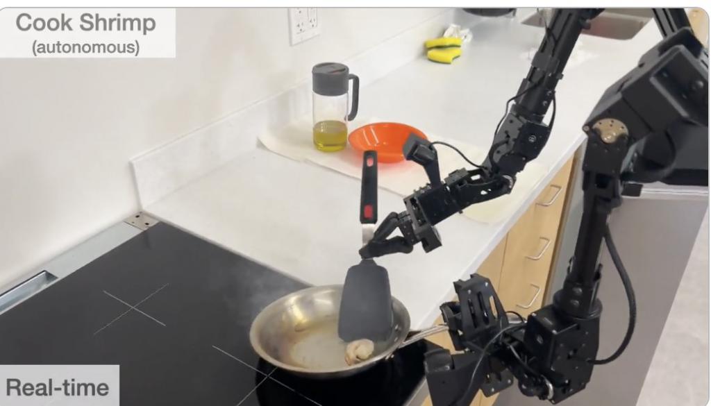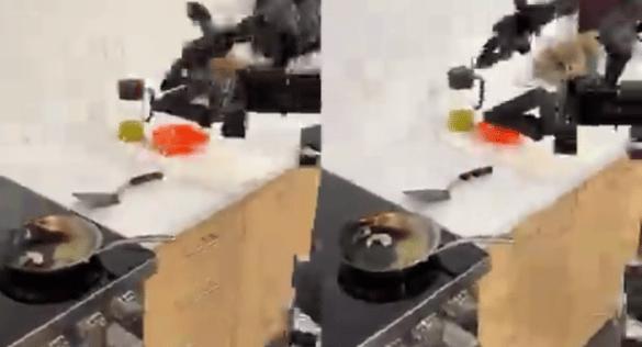 它能够按照人类做菜的顺序,将油倒入锅中,再放入一粒虾仁,并翻转锅铲将其炒熟,并拿起锅,转身将虾倒入背后已备好的盘子里。