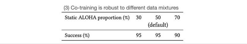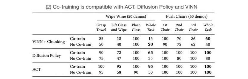 这种联合数据训练的方式,在 VINN、扩散策略和 ACT 等不同的模拟学习方法上都有着不错的效果。如扩散策略下,整个任务的成功率原本只有 35%,但经过联合训练后,可以提高到 65%。