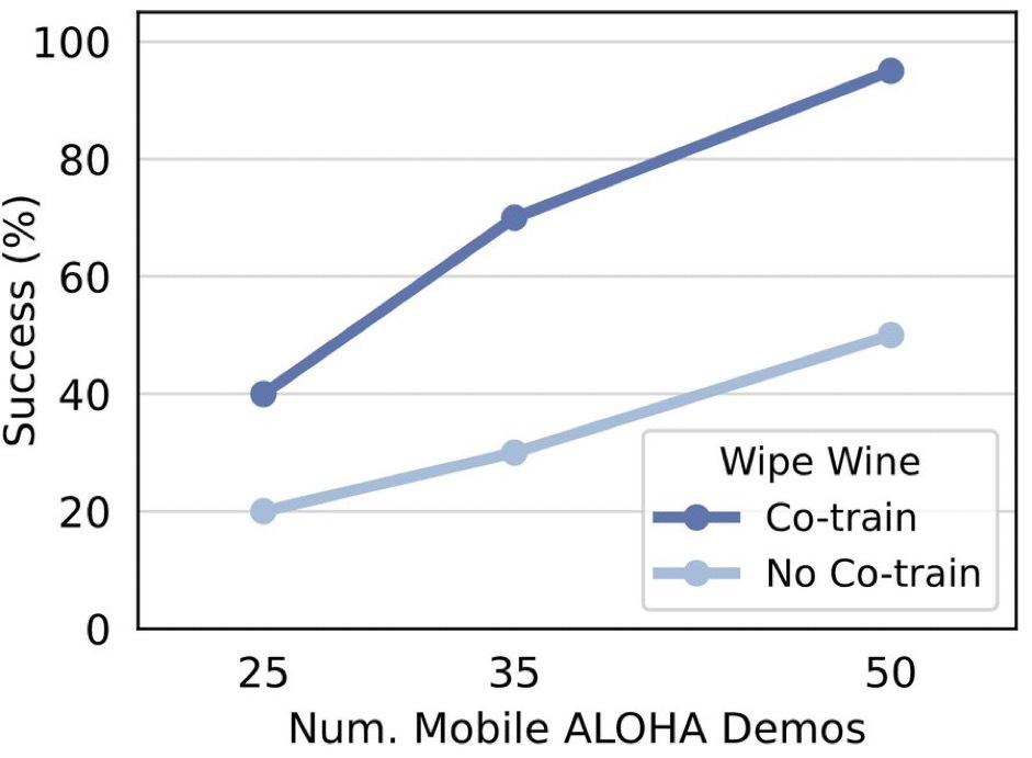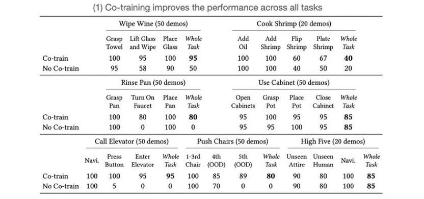通过这种联合训练方式,机器人训练成功率可以显著提高,尤其是在执行需要精确操作的任务时。如在擦拭红酒任务中,举起酒杯和擦拭是最重要的子动作,在没有联合训练时,其成功率只有 58%,但联合训练后,成功率可以提高到 95%。