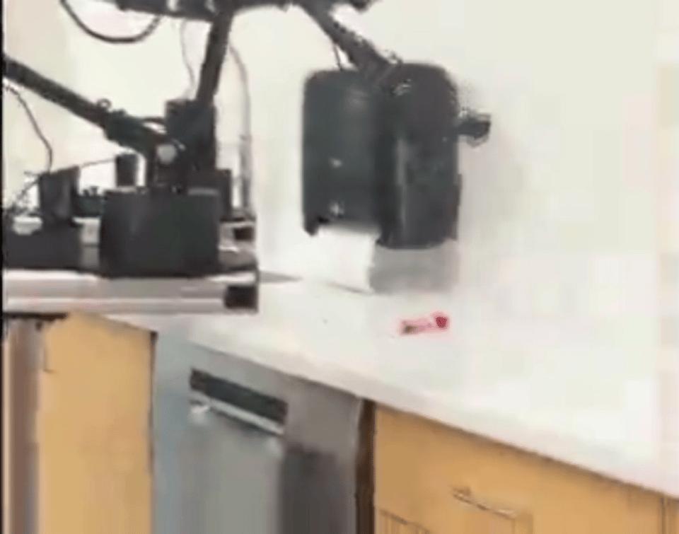 全自动状态下,它无法有力地控制住一把平底锅,将锅端起后,整个平锅便不可避免地掉落,为了拯救翻到的铁锅,守在旁边的研究人员还被烫伤了;