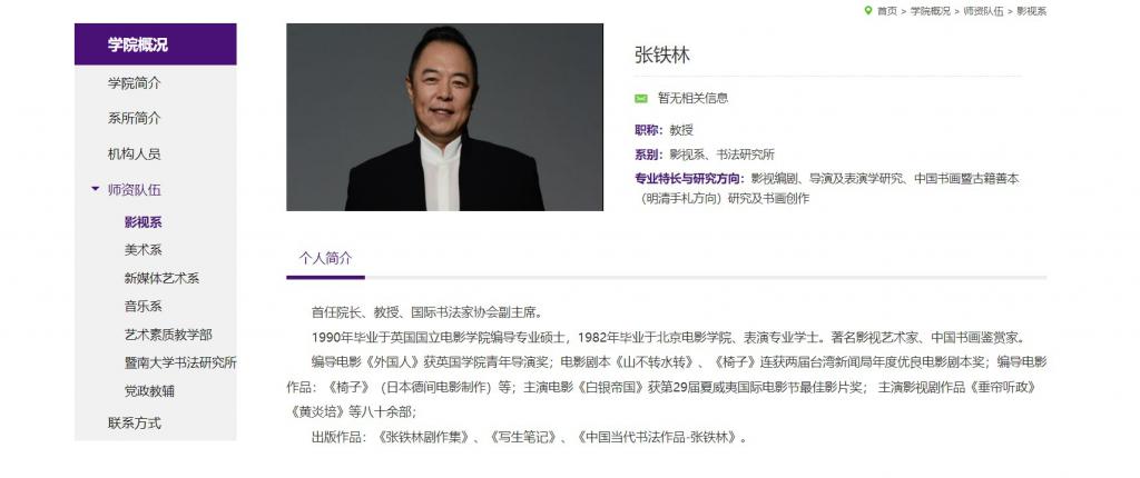早在 2005 年,暨大艺术学院创院之初,著名表演艺术家、书画鉴赏家张铁林就受聘为首任院长。他参与学院前期筹备工作,任教期间主要教授中国书画鉴赏中的明清手札鉴赏部分和导演系的电影编导课以及一些公共课。对于学院师资,他要求 " 不是‘教书匠’,而是‘艺术家’,要始终保持对艺术的敏感 ";在教导学生时,他结合丰富的演艺经验,传授表演技巧;他还会在参加的电视剧和电影制作中,为学生争取上镜机会,利用资源为学生提供实习和工作机会……他强调:" 我不希望只教给他们知识本身,还希望教给他们做人的道理、认识社会的角度,以及对学科的独立的、客观的、科学的研究方法。"