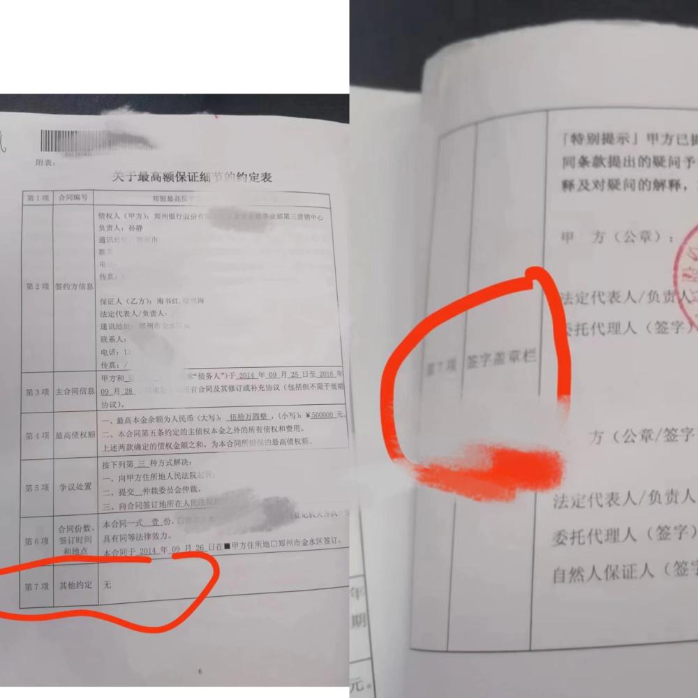 郑州银行在庭审时辩称," 关于保证合同中两项第七项重复问题,保证合同版本系制式合同,是从银行系统中自动生成后打印出来,Word 格式发生错误,导致两个第七项与第二页分层。这个属于字面技术操作错误问题,内容是没有问题的。这个可以根据合同的页码和合同上端的编码看出都是一份连贯的合同,不存在错误的现象。" 该说法被郑州中院采信。