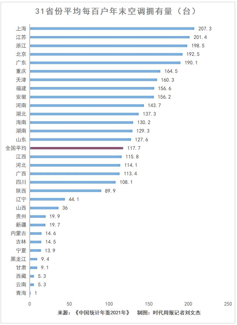 时代周报记者梳理发现,全国平均每百户家庭空调拥有量排行榜中,排名前十的省份分别是上海、江苏、浙江、北京、广东、重庆、天津、福建、安徽、河南。