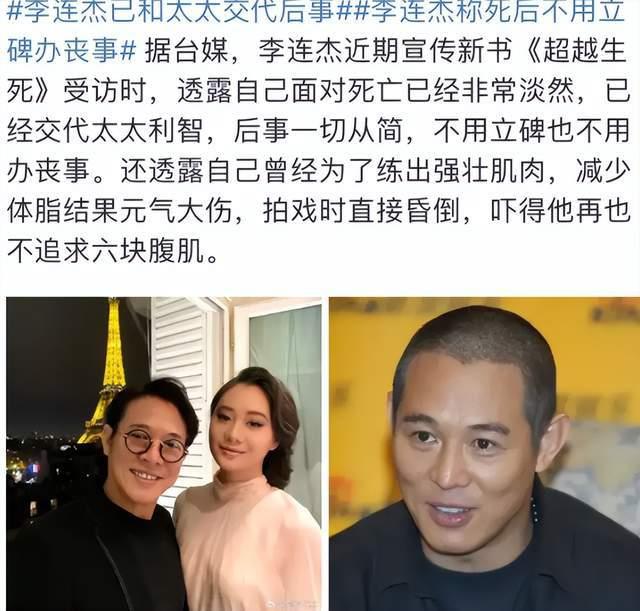 不久前,李连杰宣传新书《超越生死》,在接受采访时,他透露了自己早已看淡生死,将来走后一切从简,只要树葬或者海葬都无所谓,并且早已将20亿身家交给妻子掌管。