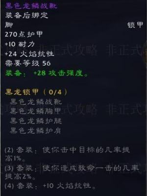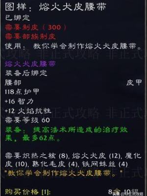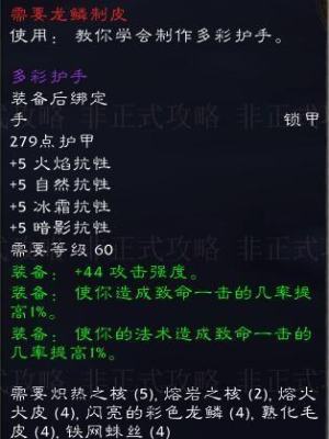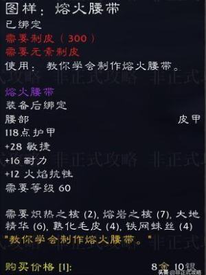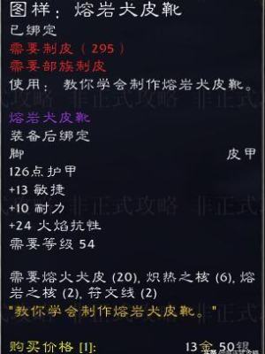 制皮:图样:熔岩犬黑皮靴(友善)、图样:熔铸头盔(友善)、图样:黑色龙鳞战靴(尊敬)、图样:熔岩腰带(尊敬)、图样:多样护手(崇敬)、图样:熔火犬皮腰带(崇敬)、图样:熔火腰带(崇敬)