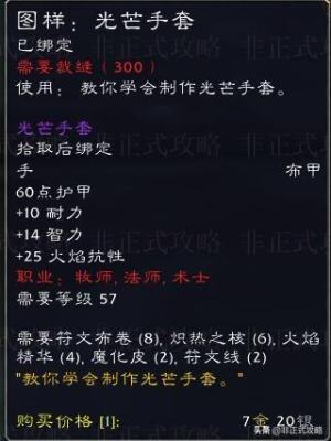 裁缝:图样:光芒手套(友善铁残)、图样:光芒衬肩在哪(尊敬)、图样:光芒长袍(尊敬)、图样:光芒护腿(崇敬)。