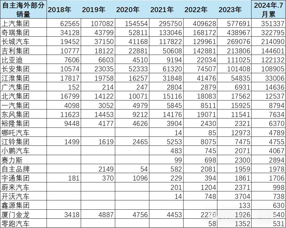 事实上,汽车出海仍是燃油车主导,也越来越显露出,这是头部企业们的游戏。2025 年时,奇瑞的海外销量是江淮集团的 2 倍左右,到 2024 年差距已经接近 10 倍。