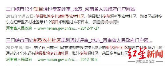在互联网上检索 " 红旗社区 " 项目会发现,河南省政府官网在 2012 年 11 月 27 日曾发布信息称,陕县张湾乡红旗新型农村社区、陕县张汴乡陕源新型农村社区、湖滨区磁钟乡东方红新型农村社区等 13 个项目顺利通过专家评审。但是记者点开链接发现,该文章已经被删除。