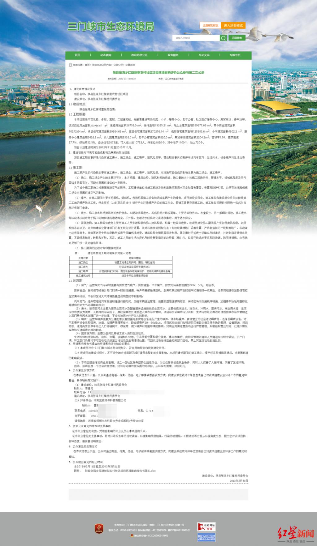 在三门峡市生态环境局官方网站上,至今可以查询到 " 红旗社区 " 项目 2013 年 3 月 18 日的环境评估公示信息。其中显示该项目总用地面积 391986.67 平方米,设计住宅 3072 套,可入住人数 10752 人。包括了多层、高层、二层住宅楼,并配套建设有幼儿园、小学、服务中心、老年公寓、社区医疗服务中心、集贸市场、停车场等。