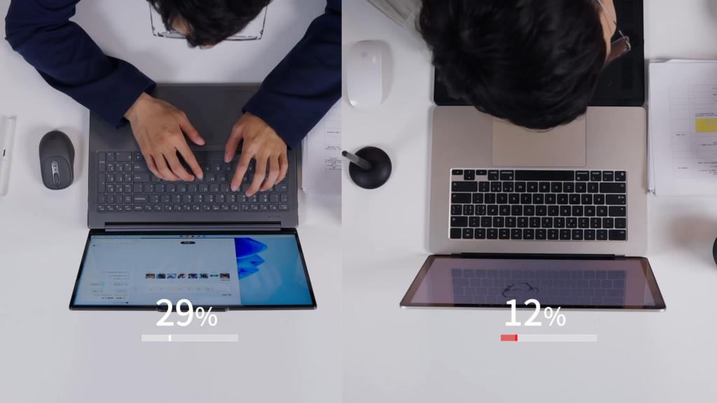 为了展示真 AI PC 生产力方面的 privilege,联想甚至拍了一只对比宣传片,用三个场景的用户体验对比 & 两位打工人的「颜艺」,狠狠 diss 了一番「名不副实」的其他 PC 们。