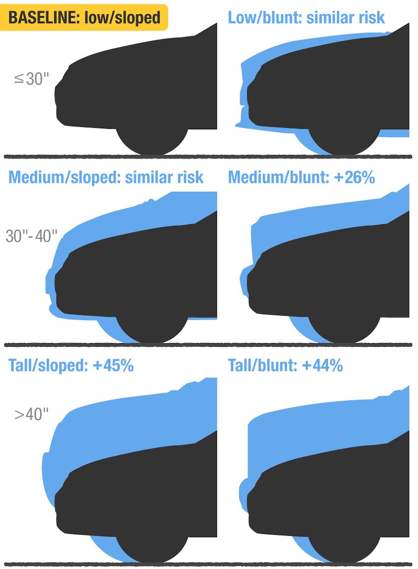 根据美国公路安全保险协会 ( IIHS ) 的研究数据,SUV 车、皮卡车等车头较高的车辆,要比其他车辆增加 45% 的死亡风险。原因主要有两个,较突出的引擎盖高度增加了驾驶者的视野盲区,而且更钝或更垂直的车辆前端会带来的伤害更大,甚至还会被卷入汽车下方。