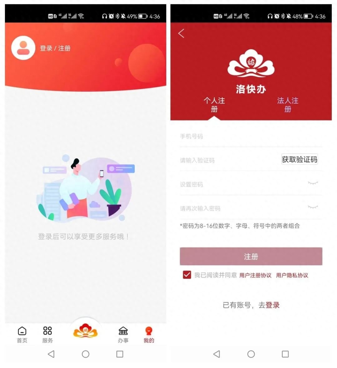 打开“洛快办”APP,点击我的,进入登录/注册界面,如未注册,点击‘立即注册’完成注册并自动登录;如已注册,点击登录,输入账号密码完成登录。