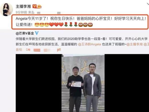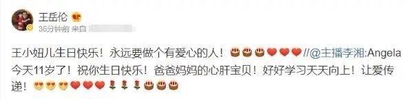 李湘还转发了这段视频给女儿送上了祝福,“Angela今年11岁了,祝你生日快乐,爸爸妈妈的心肝宝贝!好好学习,天天向上,让爱传递”,王岳伦随后也转发配文“王小妞生日快乐,永远做个有爱心的人。”