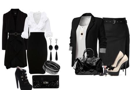 OL的选择,黑白搭配永远不会出错,左图中白色荷叶边衬衣,搭配黑色高腰筒裙,外搭收腰大衣,好像回到了优雅的赫本时代;右图中白T打底,外搭休闲西服,黑色半腰筒裙,OL的干练气质透过这简单的黑白已经强烈感受到了;