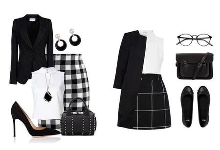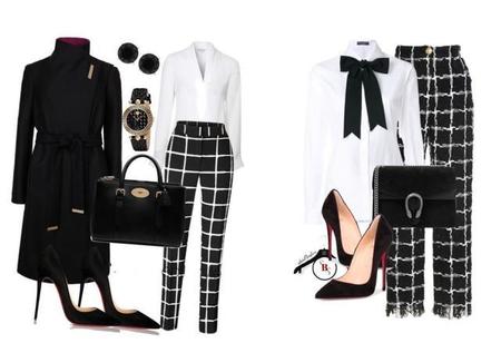此外,在单品服装的选择上避开单一的大面积黑色或者白色的服装,以黑白为主基调,选择的服装上有一些图案变化,例如:波点、千鸟格图案等等,这样的造型经典而且耐看;