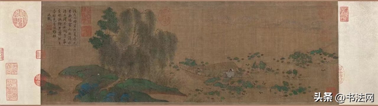 辽宁省博物馆藏有一幅佚名画作《莲舟新月图》,画中乃是周敦颐泛舟在莲叶深处,这幅画设青绿色,人物和景色用笔紧细,色彩清丽,笔致清劲,但摒弃南宋的绚烂,重精神气质而轻形貌。