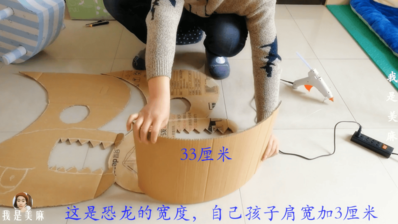 然后裁几块33厘米宽的纸板,如上图所示,用热熔胶固定粘紧。33厘米是恐龙的宽度,相当于自己孩子的肩宽再加3厘米左右。
