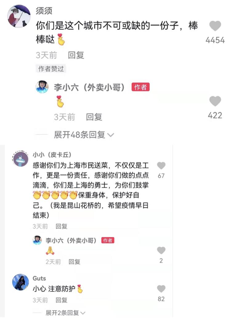 在评论区里,网友极尽可能向外卖小哥李振华表达着感谢;还有人提醒李振华注意防护,保护好自己;有人说,像李振华这样的外卖小哥,是真正的“魔都天团”。