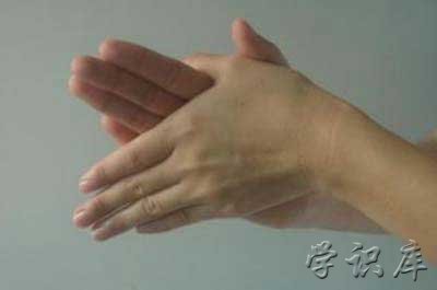 第四步(弓):洗指背,弯曲各手指关节,半握拳把指背放在另一手掌心旋转揉搓,双手交换进行。