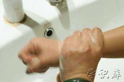 第七步(腕):洗手腕手臂,揉搓手腕、手臂,双手交换进行。