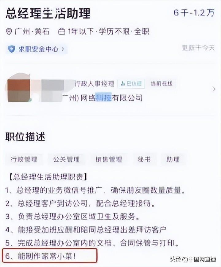 广州这家科技公司的招聘内容显示,职位是总经理生活助理,月薪6000元到1.2万元,工作经验1年以下,学历不限。岗位职责除了总经理业务微信号推广,确保朋友圈数量质量,客户到访公司配合总经理接待等外,还有制作家常小菜。