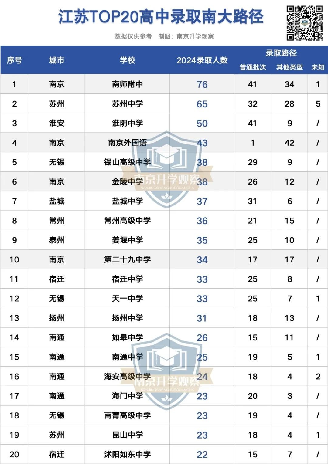 具体人数上,南师附中超苏州中学、淮阴中学、南外等,以76人位居榜首。