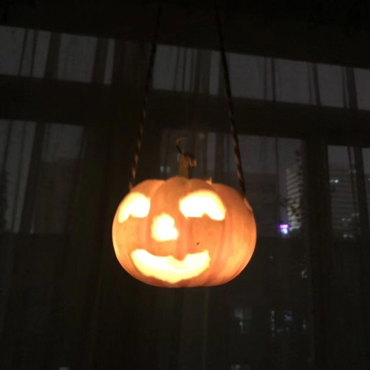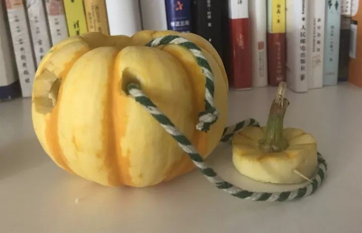a、六六的南瓜灯很小,所以可以方便提起。开固定绳子的口时,一定要注意开洞位置,确保提起时南瓜灯可以保持平衡。