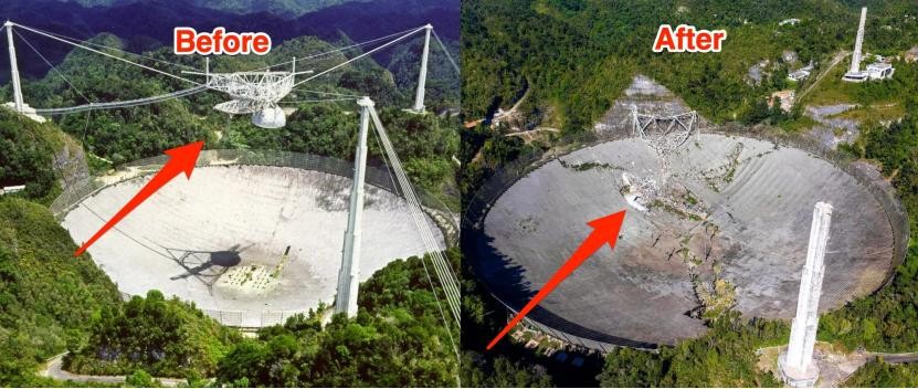 △阿雷西博望远镜发生垮塌前后对比(图片来源于网络)