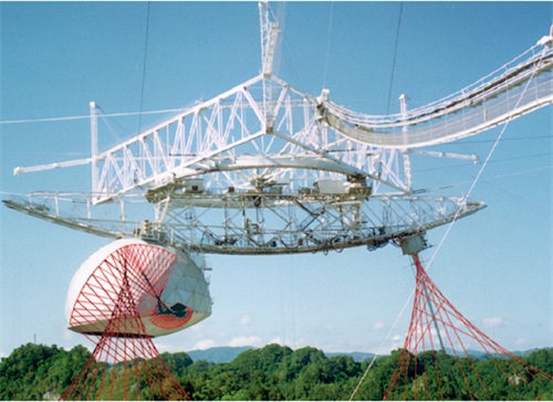 阿雷西博望远镜于1963年建成,口径305米,在其主镜盘上方接近150米的高处,悬吊着重达900吨的科学设备平台。在2016年9月“中国天眼”500米口径球面射电望远镜(FAST)建成前的53年中,它一直是世界最大的单口径射电望远镜(这类望远镜区别于传统的光学望远镜,接收的是无线电信号)。