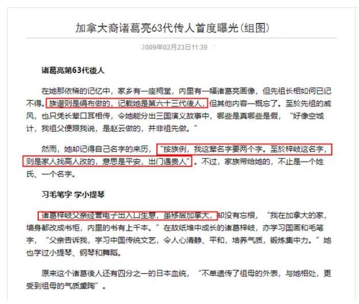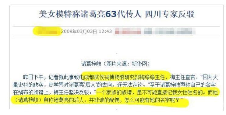 “史学界对诸葛亮后人的去向还无法定论。但一个家族的族谱里,是不可能直接记载女性姓名的。而她自称诸葛亮的后人,并非谁的配偶,怎么可能有她的名字呢?”