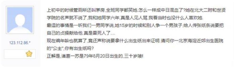 知情人称,诸葛紫岐初中是在北大二附中上的,高中则是在世贤读的。中学时候她还把厕所叫做“茅房”,根本没在外国念过书。