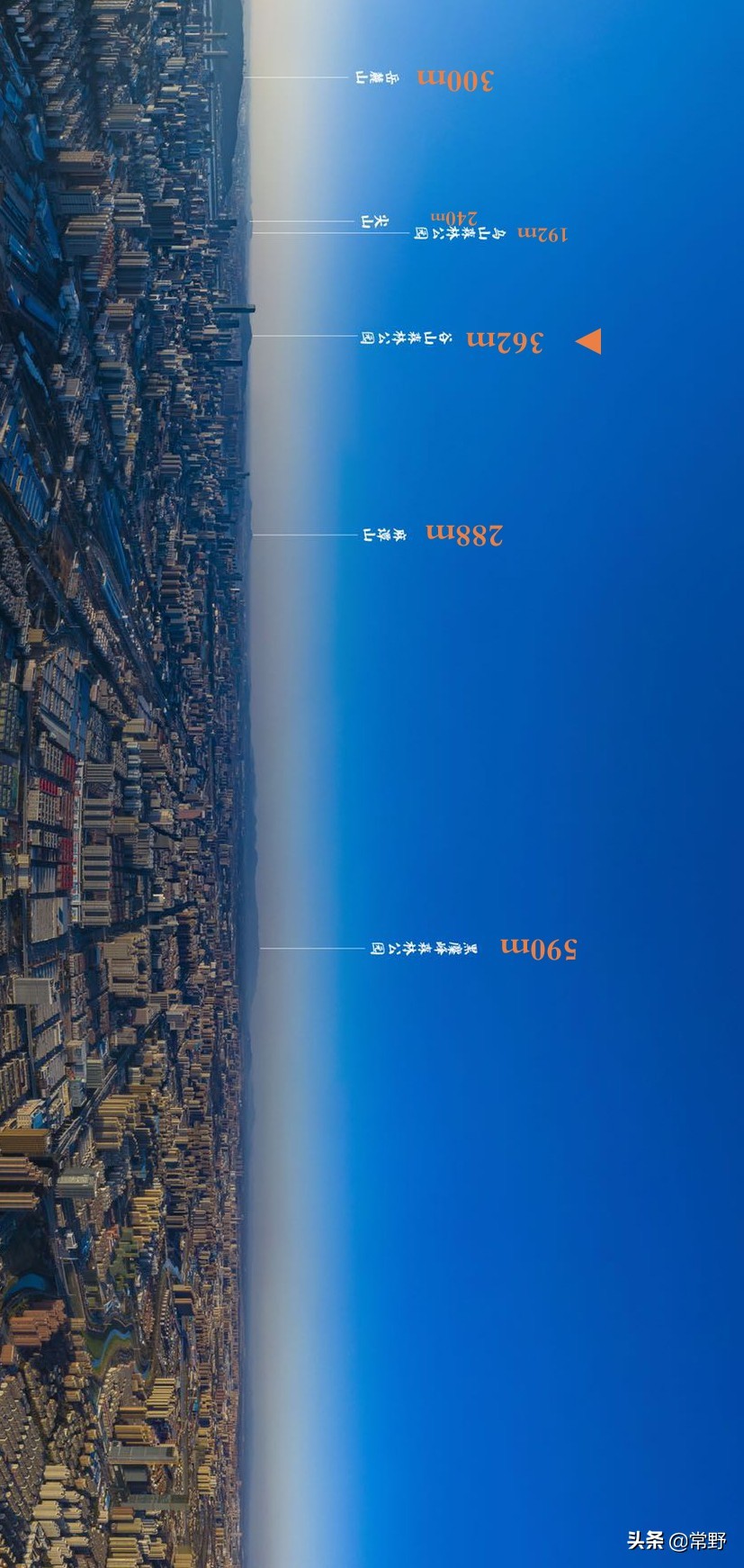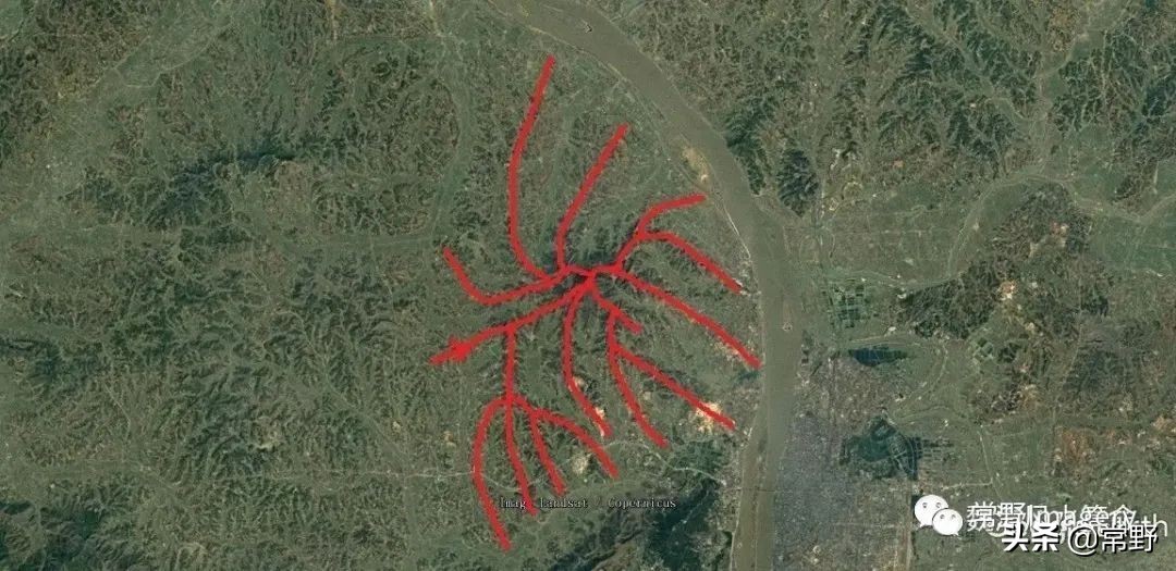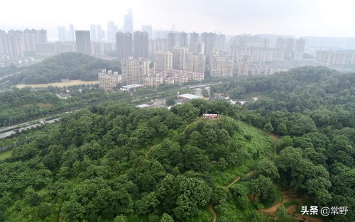 从长沙河东的角度航拍,可以清晰看到谷山的位置和高度。