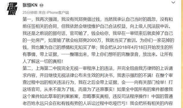 但是呢,作为一个男人的张恒似乎没有善罢甘休的味道,而且向有关部门起诉,对有关的决定表达了不满,然而有关部门没有对此表示异议,而是维持了原判,这让作为渣男的张恒心里不舒服,所以内心的不满再次爆发了,而且扬言还掌握更多前女友郑爽的负面新闻。