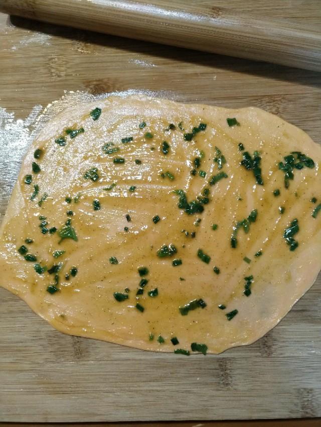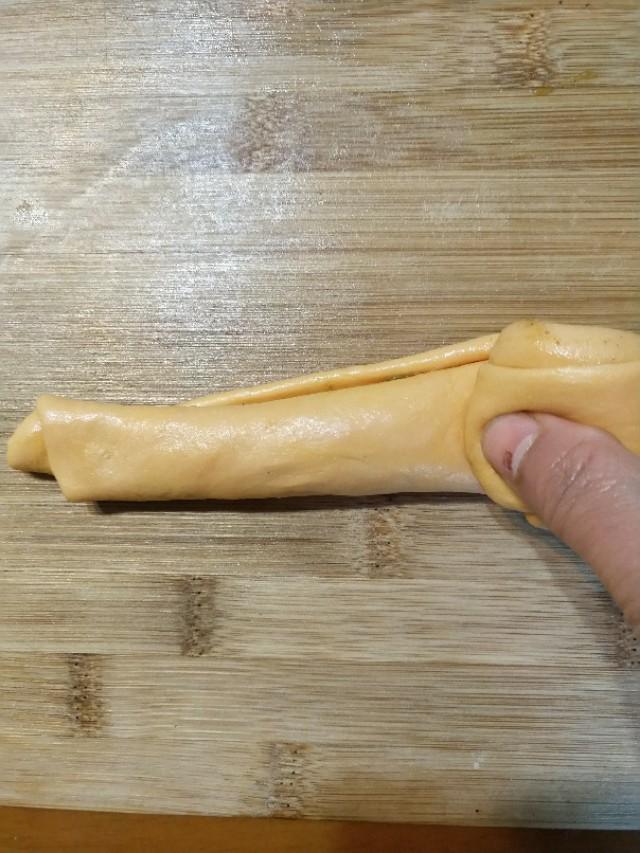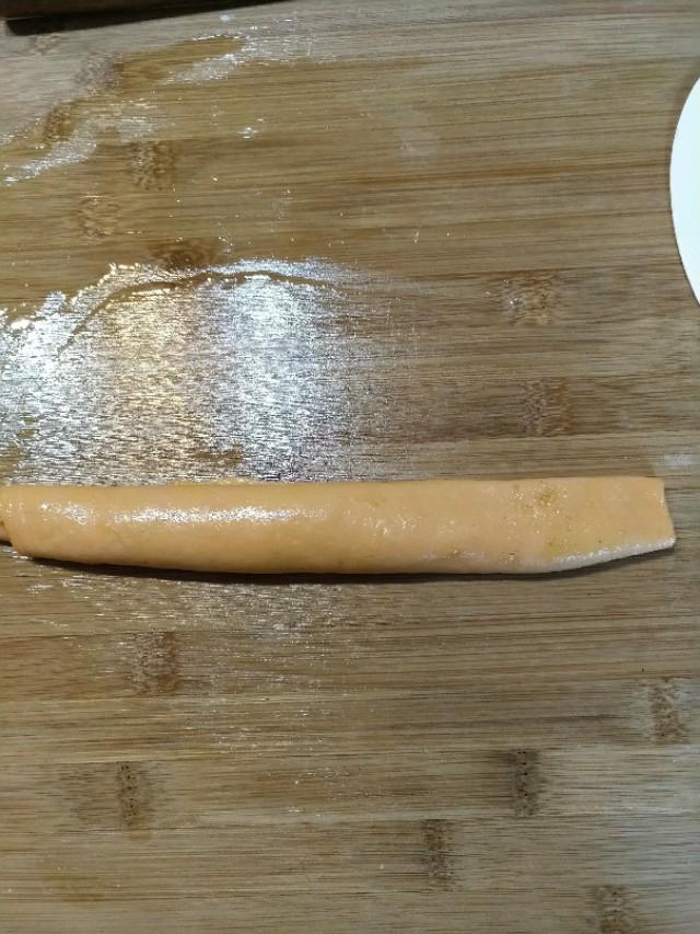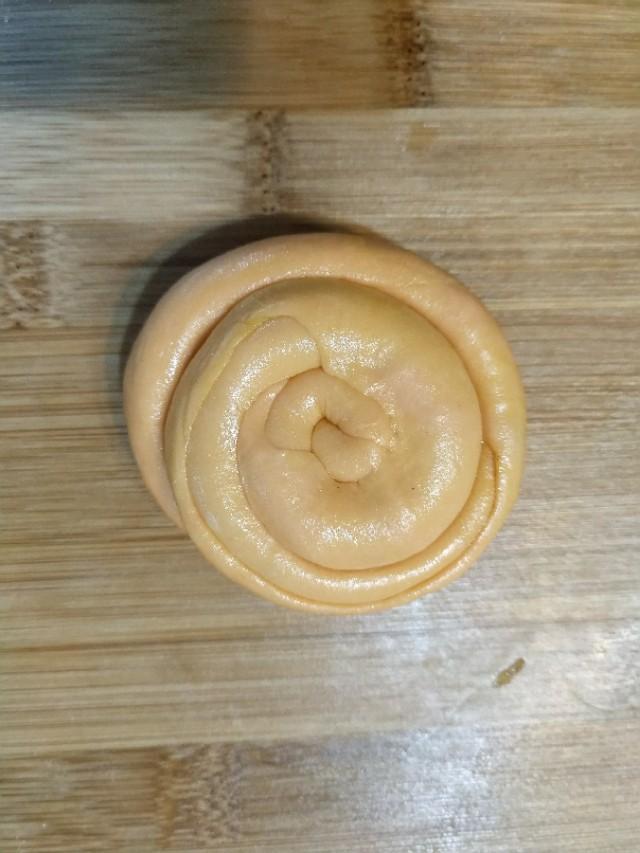 再从一头用手边抻边卷起来做法,卷成软一个圆饼把面粉另一头压在辅食下面。