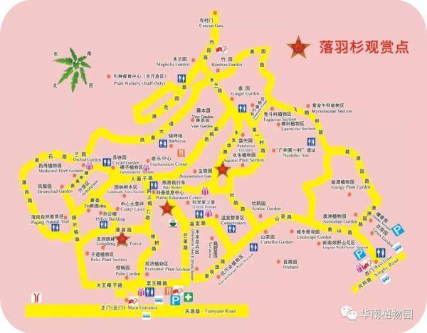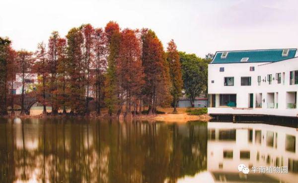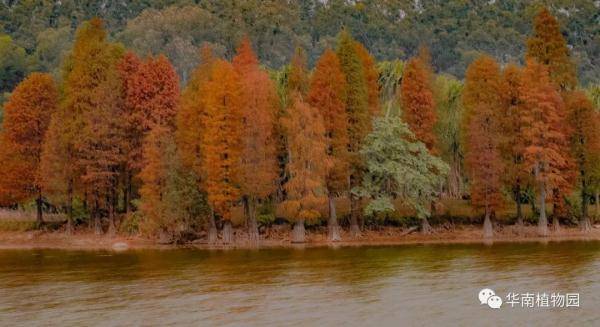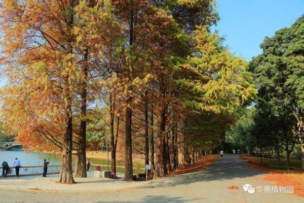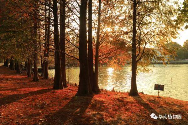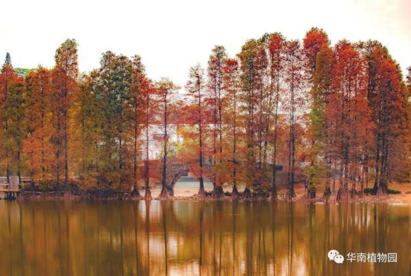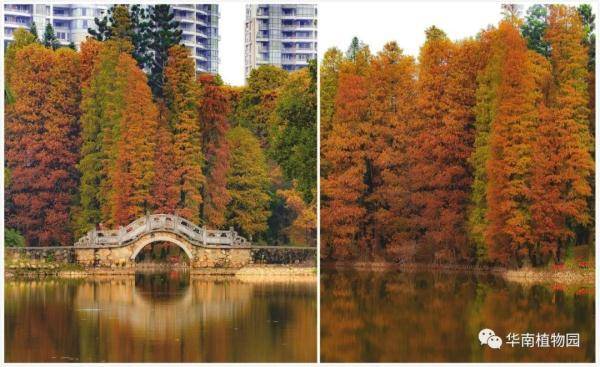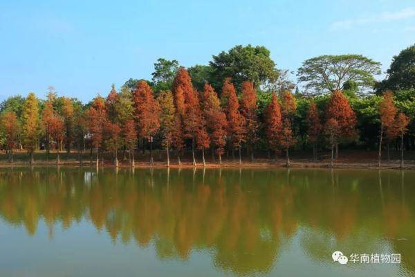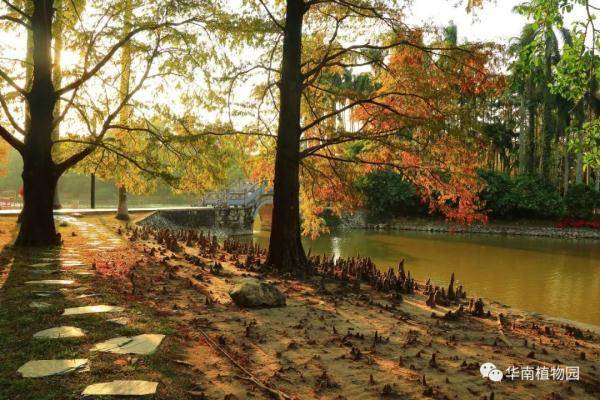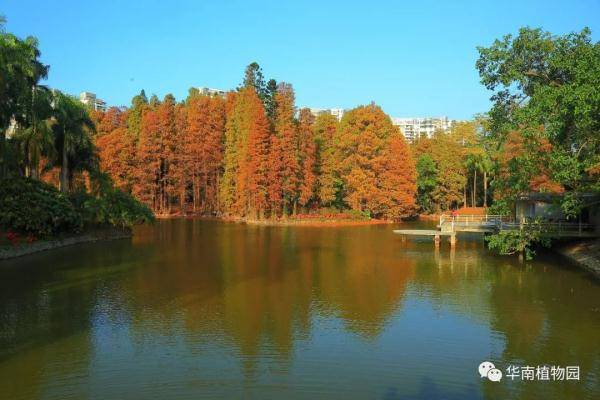 落羽杉、池杉、水松、水杉等都喜欢生长在水边,华南植物园水边有多处观赏红叶的景点——龙洞琪林(孑遗植物区、棕榈园)、水生植物园两岸及湖中心露兜园、科普信息中心前三拱桥边、高山植物室门口等处。